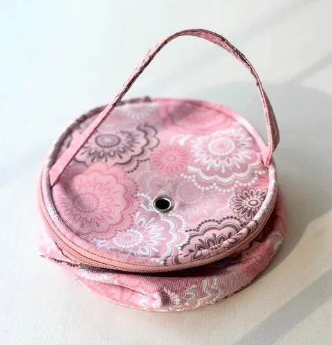 Create your project anywhere, on the go or at home. The handle is comfortable. The grommet/hole in the top lid lets you feed your working yarn through and the zipper closes the bag when not in use. They are totally collapsable for space saving storage. Perfectly practical~